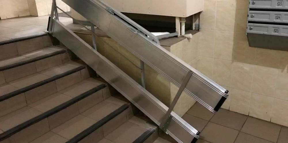 Особенно хорошо откидные пандусы подходят для использования в жилых домах, как у входа в подъезд, так и на внутренних лестничных пролетах, если отсутствует лифт. Преимущества таких конструкций заключаются в том, что в нерабочем состоянии они прилегают к стене, не загромождая проход. Обеспечивается высокая степень безопасности благодаря надежной фиксации на ступенях. Их установка отличается оперативностью и простотой, а стоимость, как правило, невысока. Крепление может осуществляться к стене, ступеням или поручням.